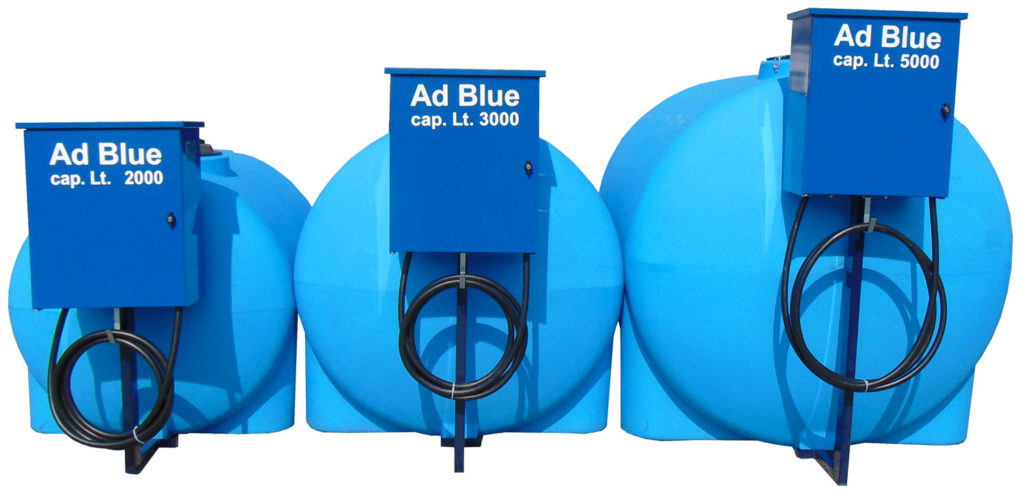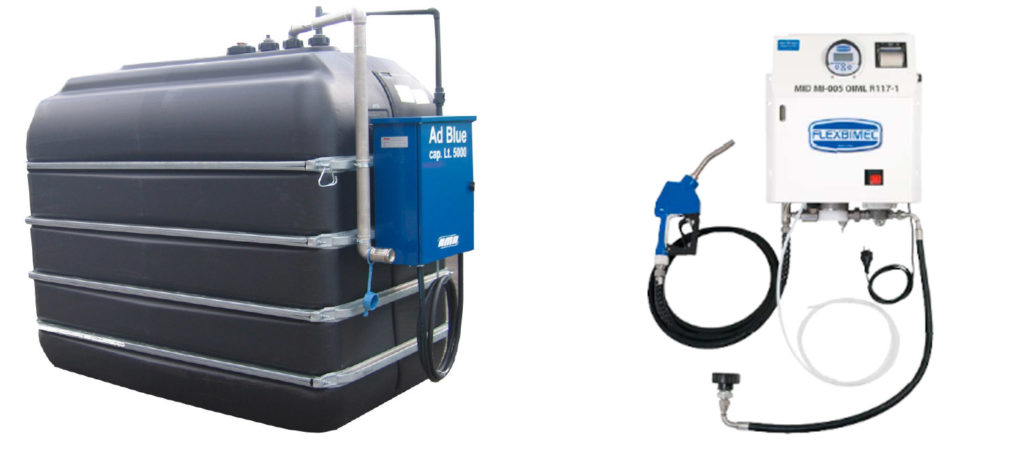 Serbatoio rettangolare o cilindrico costruito in polietilene per la distribuzione di AdBlue, dotato di contalitri certificato MID MI-005, pistola di erogazione automatica in acciaio inox e di sistema automatico di scarico dell’aria eventualmente presente nei circuiti di distribuzione.